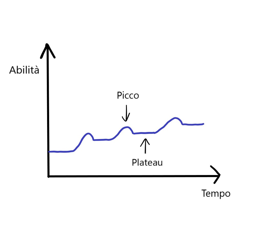 - Plateau. è la fase solitamente meno piacevole: lavoriamo sodo a lungo senza vedere un briciolo di miglioramento, e spesso ci sembra di non esserci schiodati dal punto di partenza. In questa fase le peggiori domande ci attanagliano: cosa continuo a provarci se tanto non miglioro? Perchè sto qui a faticare e perdere tempo se poi non ottengo alcun risultato? Forse è meglio che smetto e mi dedico ad altro. Queste domande riflettono alla perfezione la mentalità odierna: se non otteniamo un risultato tangibile in poco tempo, ci sentiamo degli scarti o delle nullità. Non sorprende se poi ci dedichiamo ad altri obiettivi che riteniamo “più abbordabili”.