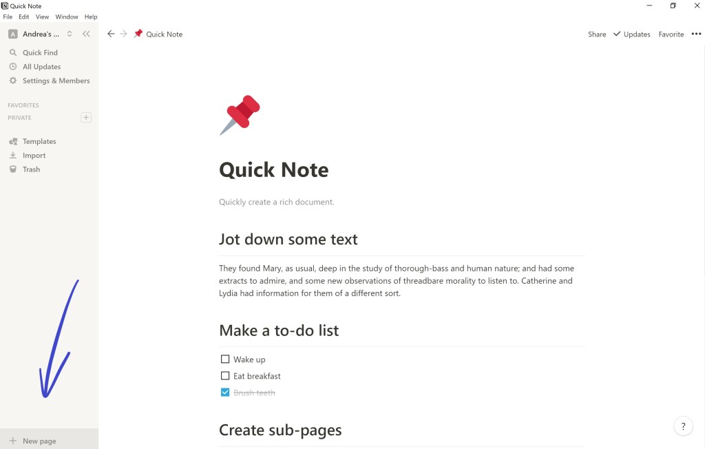 Ok, abbiamo scaricato Notion sul nostro PC o Mac e abbiamo creato il nostro account. All’apertura ci ritroviamo davanti alcune pagine predefinite, che a prima vista possono lasciarci spaesati. Tuttavia noi sappiamo già che dobbiamo andare in basso a sinistra↙ e cliccare su “New page”: