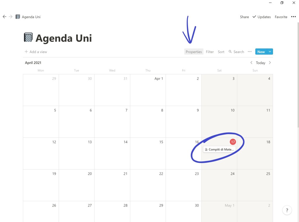 - è possibile utilizzare l’opzione “Sort”, in alto a destra di fianco a “Properties” (vedi Passo 9) per riordinare come preferiamo più attività presenti in un solo giorno. Io ad esempio le ordino in base al “quando”, ovvero al momento della giornata in cui devo svolgerle.