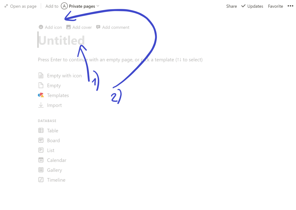 Sorprendentemente, cliccando su “New page” si aprirà una nuova pagina. A questa vogliamo dare un titolo adeguato (freccia 1) e, perché no, una bella icona (freccia 2):