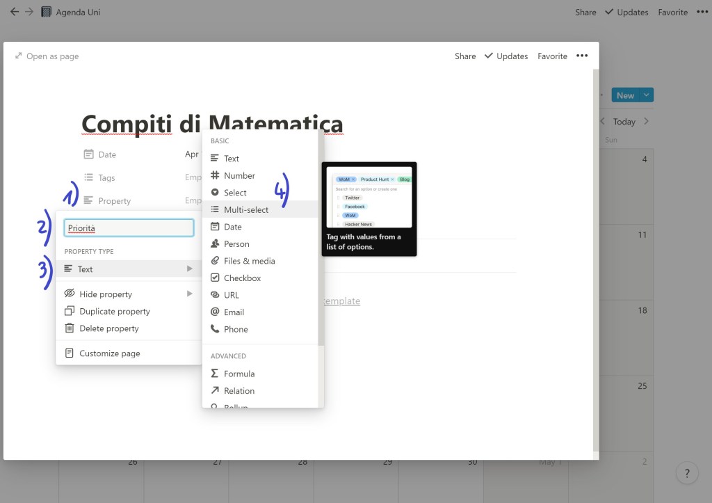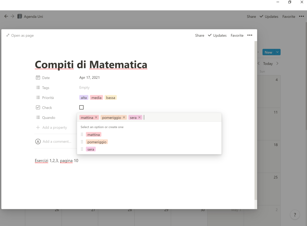 Aggiungiamo infine una terza ed ultima proprietà, ovvero il quando: per farlo è sufficiente ripetere il procedimento del passo 5, e creare ad esempio le opzioni “mattina”, “pomeriggio” e “sera”: in questo modo con una semplice occhiata👀 sapremo quando dobbiamo svolgere i nostri compiti di matematica.