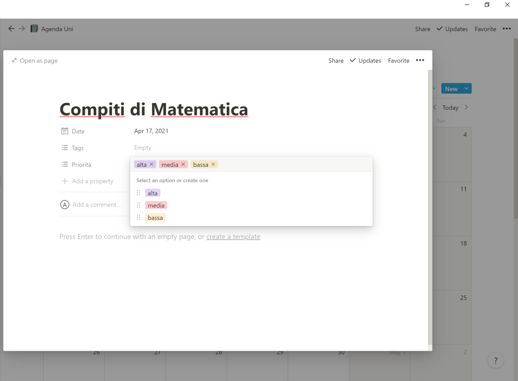 Un breve excursus che si può tranquillamente saltare. Come forse avrai notato ai passi 5,6 e 7, sopra la scritta “Property” è presente la scitta “Tags”. Qui possiamo mettere un po’ quello che vogliamo, ad esempio il nome della materia; io personalmente non lo trovo necessario, perché indico la materia nel titolo dell’attività (ad esempio “Compiti di Matematica”). Ad ogni modo il tag può essere utile per altri tipi di attività, dunque in questo caso ho inserito “matematica” giusto per mostrare come si possa metterlo in evidenza insieme alle altre proprietà.
