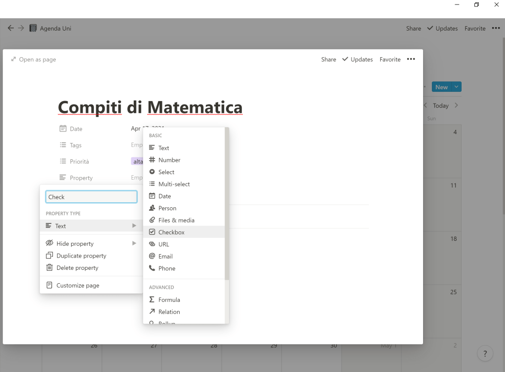 Abbiamo creato una proprietà che ci permette di affidare ad ogni nuova attività il livello di urgenza. Ora decidiamo di aggiungere un’altra proprietà, ovvero un quadratino che potremo spuntare una volta terminata l’attività✅: comodo vero? Per farlo creiamo una nuova “Property”, la rinominiamo ad esempio “Check” e come prima cambiamo il tipo predefinito “Text”, questa volta scegliendo però “Checkbox”. Il tutto è riportato in figura qui sotto: